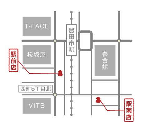 豊田市駅より徒歩一分(駅前店)と徒歩三分(駅南店)の二店舗がございます。