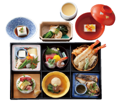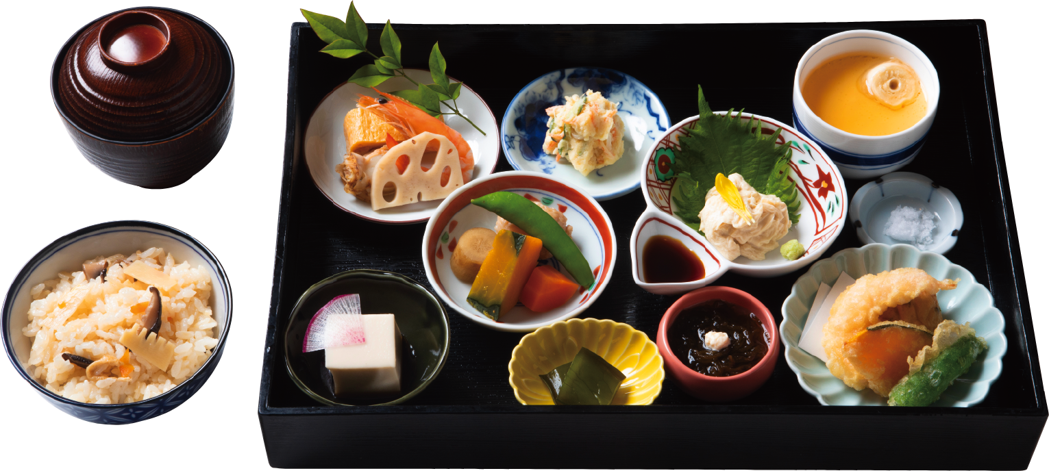 季節の盛肴・湯葉刺身・天ぷら・自家製ごま豆腐・茶碗蒸し・ご飯(炊き込み又は白飯)・味噌汁 ※ご飯おかわり自由